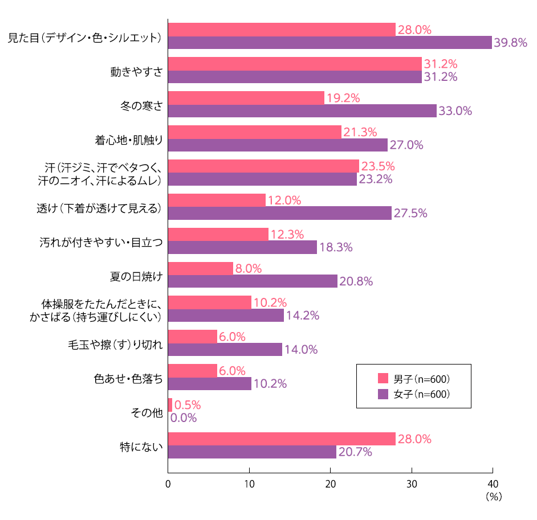 特に、女子生徒は「見た目(デザイン・色・シルエット)」(39.8%)、「冬の寒さ」(33.0%)、「透け(下着が透けて見える)」(27.5%)、「夏の日焼け」(20.8%)といった項目が男子生徒に比べて10ポイント以上高くなり、体操服の着用時に気になることが多い傾向がみられました。