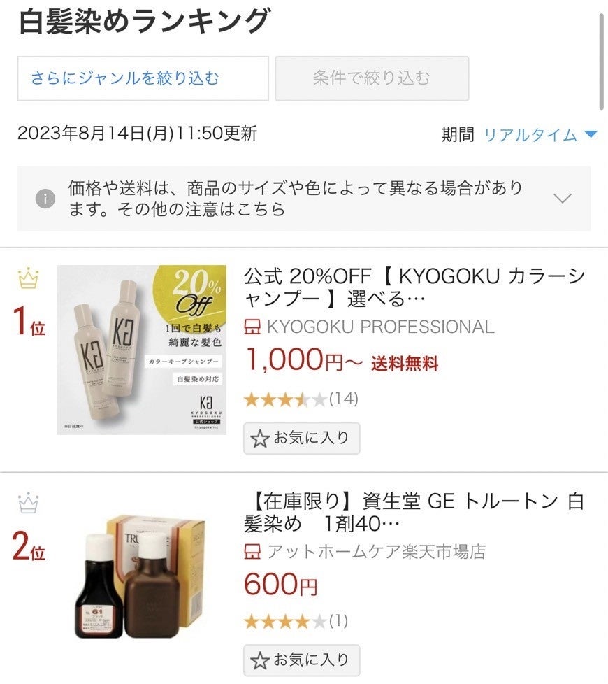 楽天市場の「白髪染め部門と全体染め部門」でも1位を獲得いたしました。