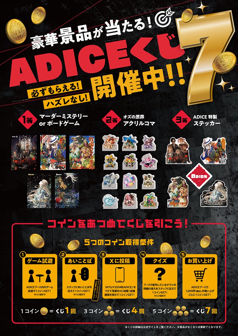 ゲームマーケット2024秋のブースにおいて、どなたでも無料で楽しめる、ハズレなしの『ADICEくじ7』を実施します。