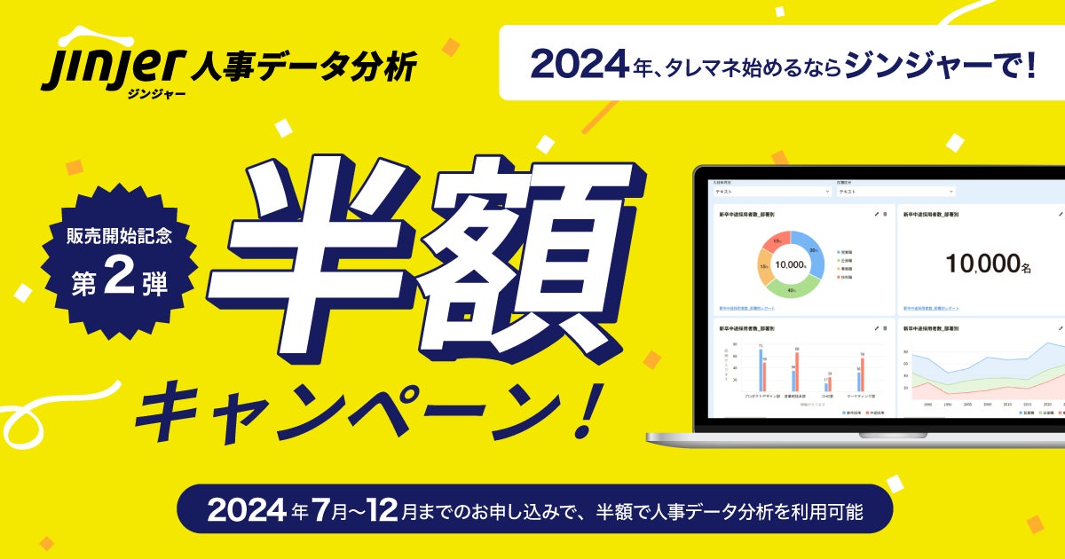 クラウド型人事労務システム「ジンジャー」を提供しているjinjer株式会社(本社:東京都新宿区、代表取締役社長:桑内 孝志)は、人的資本の可視化・分析がレポート・ダッシュボード上で簡単に設定できる「ジンジャー人事データ分析」の販売開始に伴い「月額利用料 半額キャンペーン(2024年7月〜12月お申し込み限定)」を実施することをお知らせします。