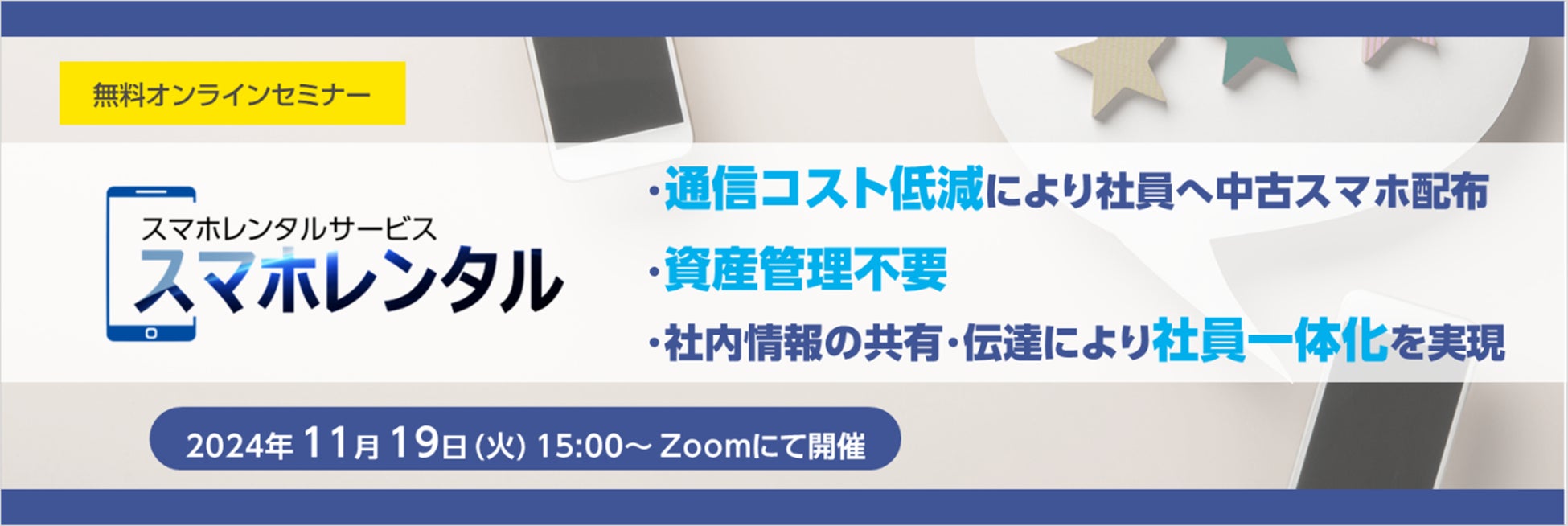 株式会社ニーズウェル(本社:東京都千代田区、代表取締役社長 船津浩三)は、2024年11月19日(火)15時より、無料オンラインセミナー「通信コスト低減ソリューション「スマホレンタルサービス」~通信コスト低減により社員へ中古スマホ配布・資産管理不要、社内情報の共有・伝達により社員一体化を実現します~」を開催します。