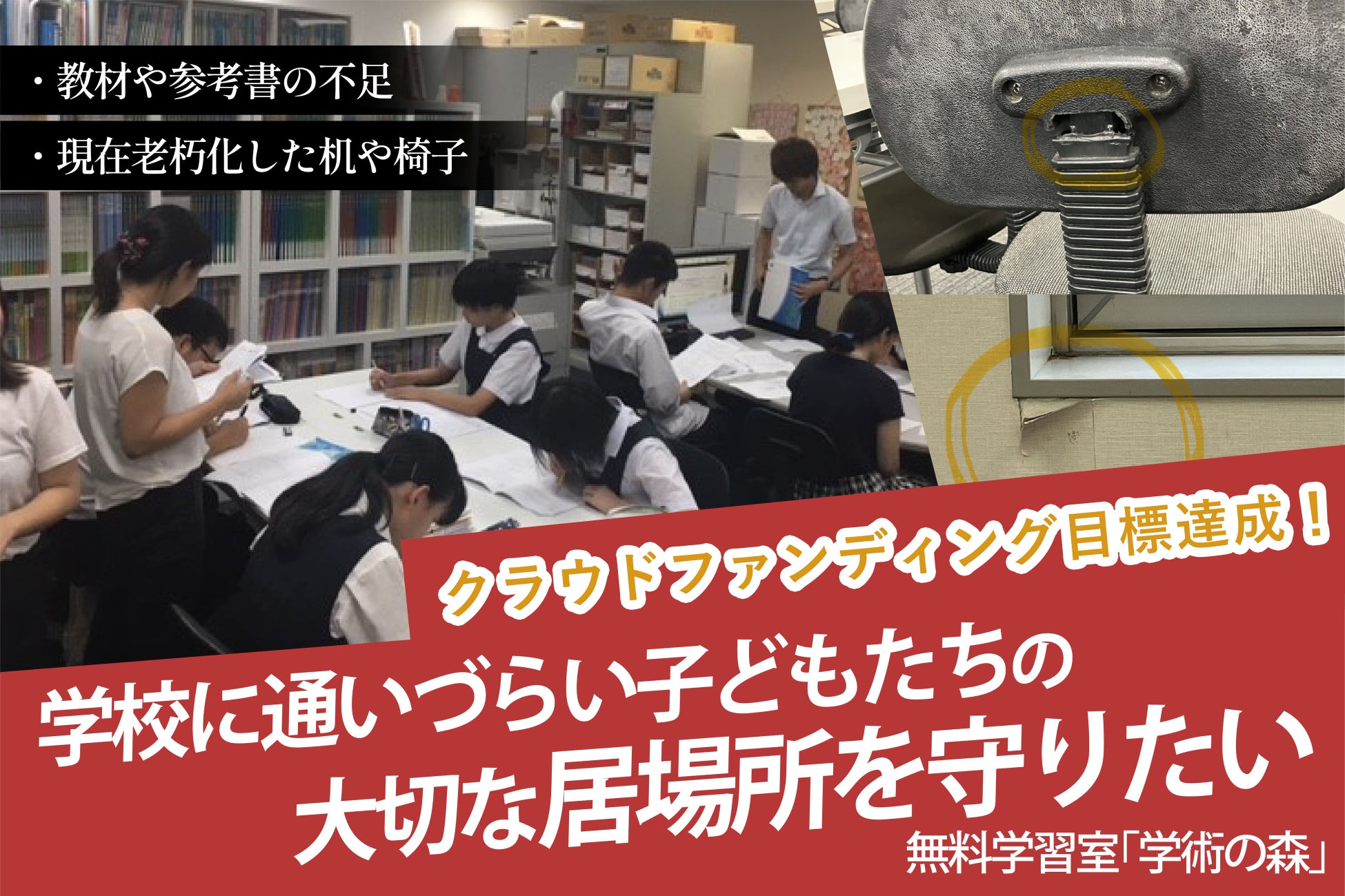 このプロジェクトは、福岡県にある無料学習室「学術の森」の老朽化した設備の改善や、新しい教材の購入を目的としてスタートしました。学術の森は、不登校やいじめなどで学校に通いづらい子どもたちに、安全で安心して学べる環境を提供する施設です。しかし、現在の施設は老朽化が進んでおり、学習に必要な備品や設備が不足していました。今回の支援により、子どもたちがより快適に学習できる環境を整備することができます。