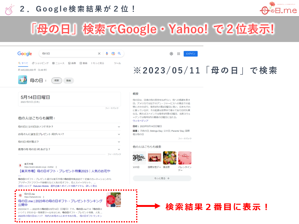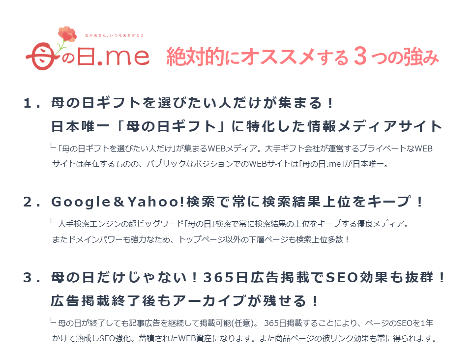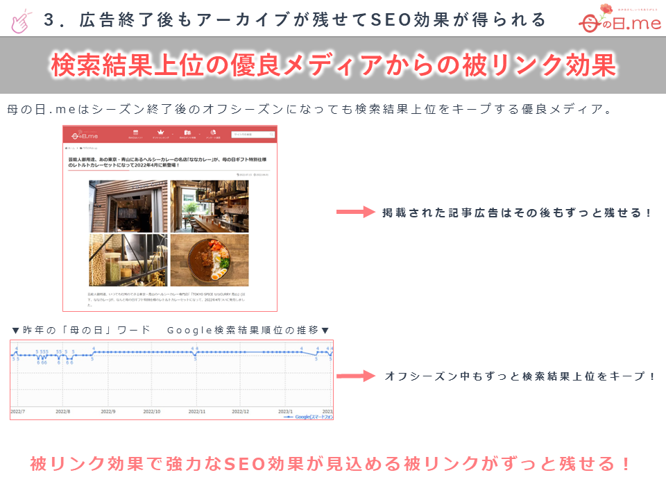 上記の通り、母の日.me自体が検索結果上位に表示されるメディアのため、「優良メディアからの被リンク」としてSEO効果が期待できる点も、他メディアに真似のできない大きな強みの1つです。