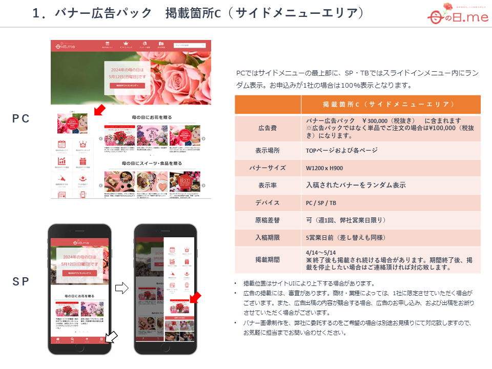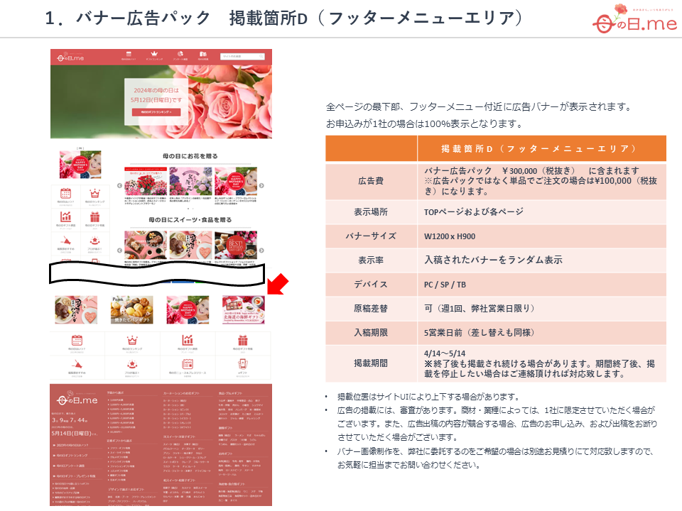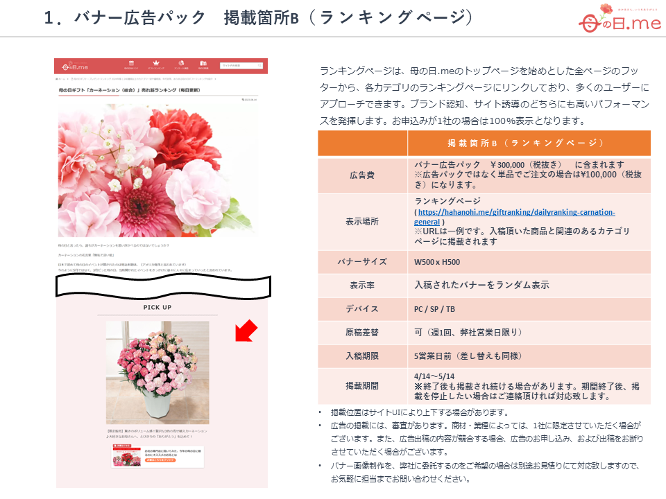 母の日.me内のTOPページやランキングページなど、各種コンテンツページの広告バナー枠にバナー表示させられる広告プランです。