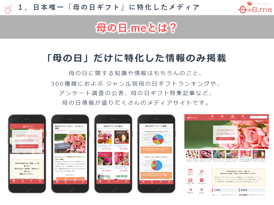 母の日.meは日本唯一、「母の日」だけに特化した専門のWEBメディアです。母の日に関する知識や情報はもちろんのこと、300種類におよぶ ジャンル別母の日ギフトランキングや、アンケート調査の公表、母の日ギフト特集記事など、母の日情報が盛りだくさんのメディアサイトです。そのため、母の日ギフトの商品に対しては、より強い訴求効果を発揮致します。