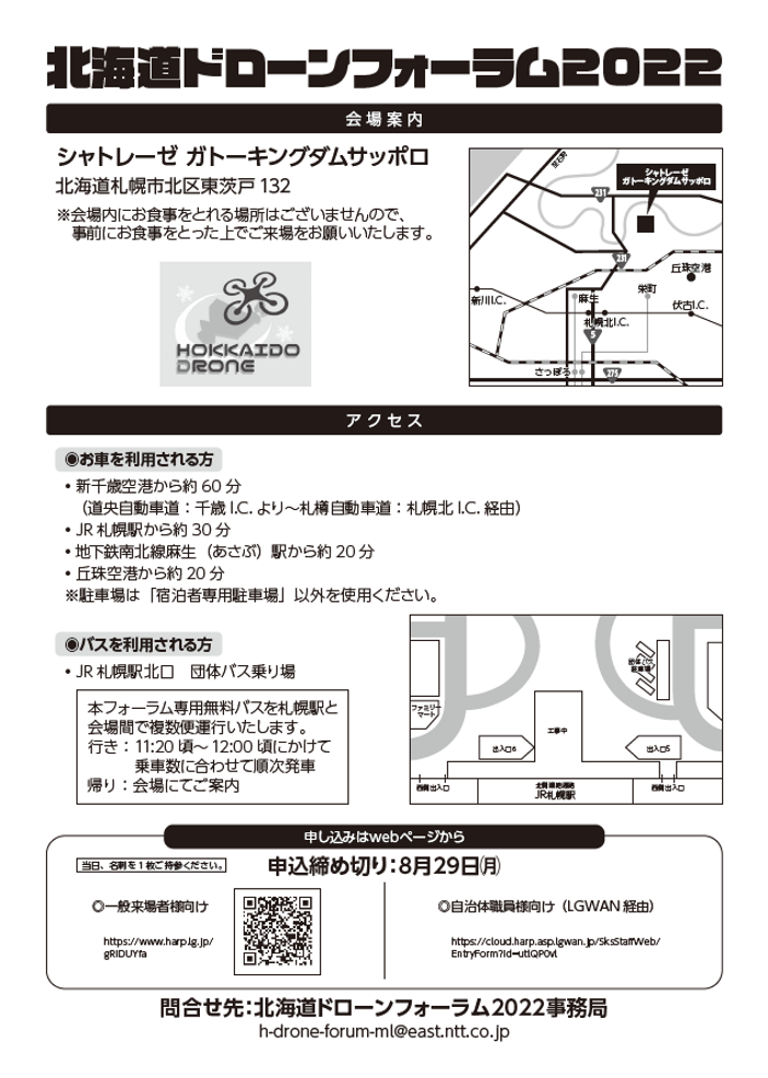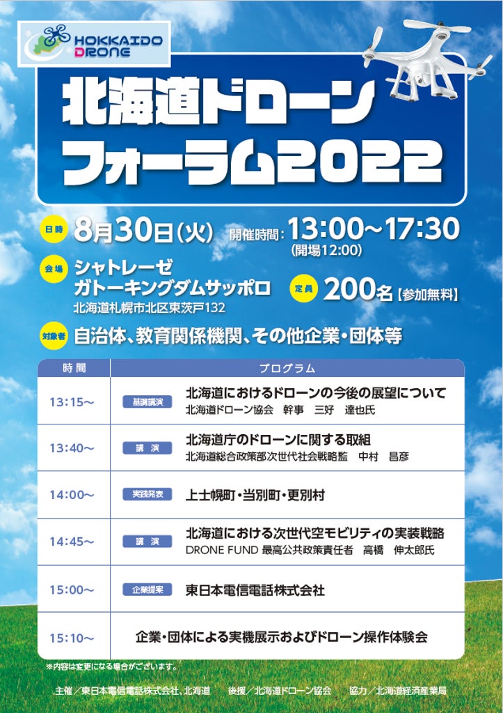 北海道(知事 鈴木 直道)と東日本電信電話株式会社 北海道事業部(執行役員 北海道事業部長 阿部 隆、以下「NTT東日本」)は、北海道経済産業局の協力のもと「北海道ドローンフォーラム2022」を開催します。