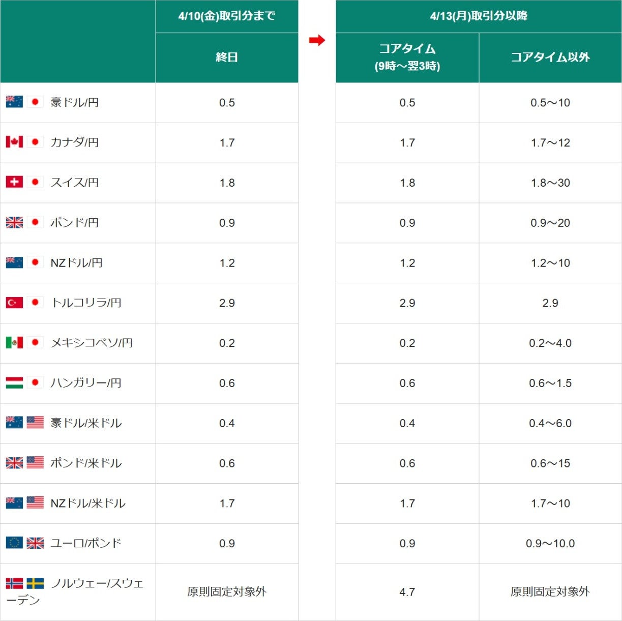 米ドル/円以外のより幅広い通貨ペアでも、お客様にお取引いただきやすい環境を提供するべく、新たに18通貨ペアの通常スプレッドの縮小および全通貨ペアのコアタイム制導入を決定いたしました。