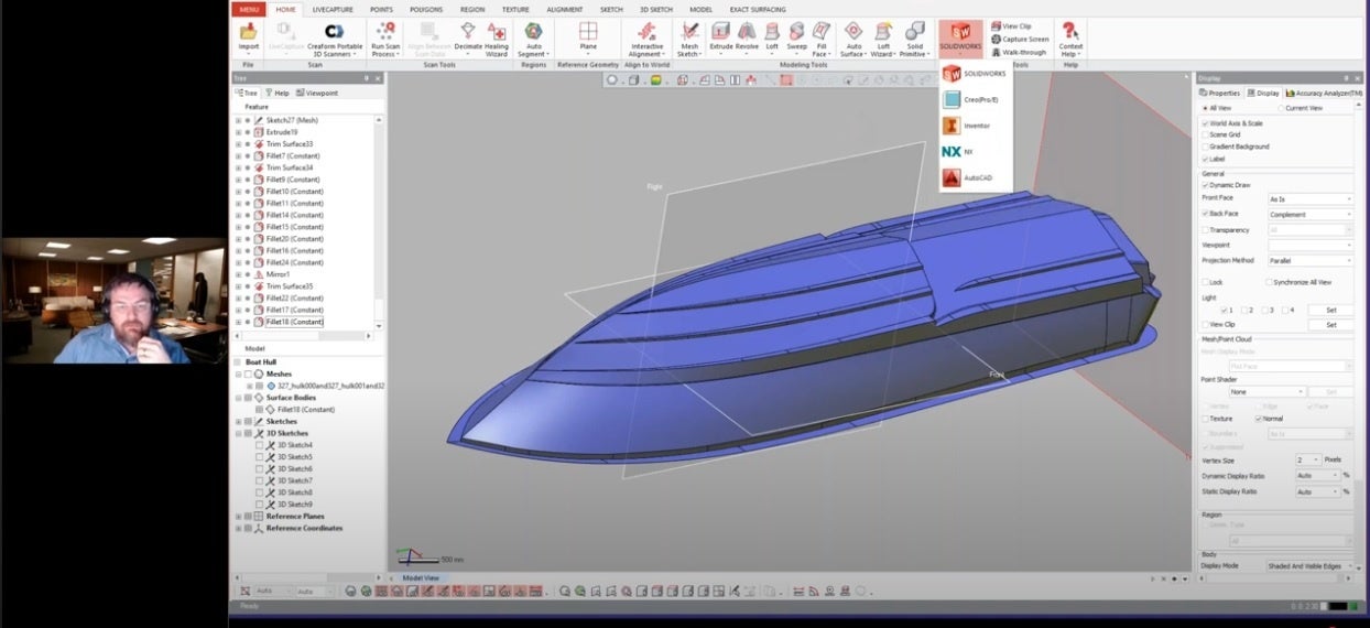 9時間余りでボートの形状を仕上げ、最終的に、SolidworksやCreo、InventorといったパラメトリックCADにデータを受け渡すところで終わっています。