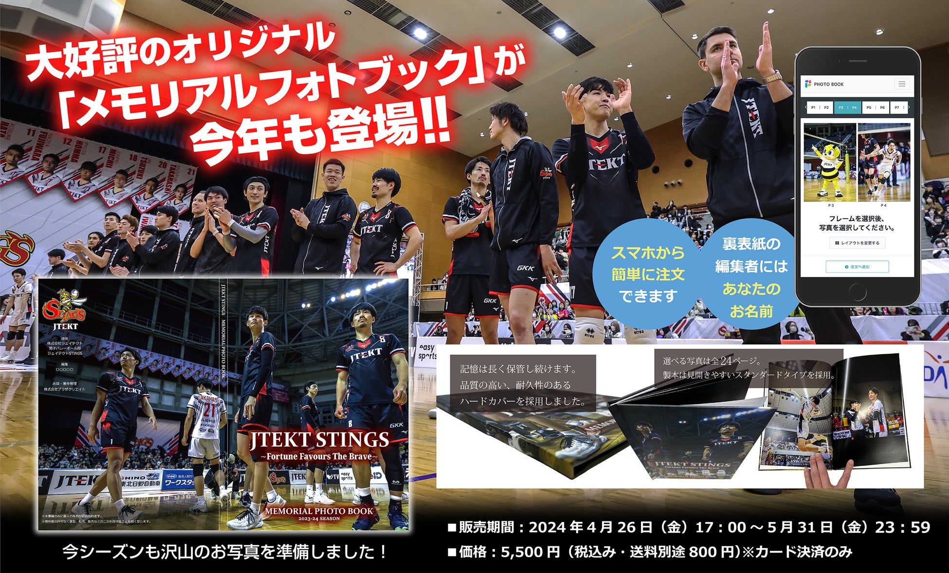 2023-24シーズンもジェイテクトSTINGS を応援いただき、誠にありがとうございます。そして、現地またはオンラインショップでSTINGS グッズをご購入いただきました多くの方々に感謝を申し上げます。2021-22より完全オリジナル『メモリアルフォトブック』が作れるサービスを初めて導入して以来、毎年ご好評をいただいており、2023-24シーズンも期間限定で提供させていただくことにいたしました。今回は多くのご要望を受けて、各選手のプレー中の姿に加えて、試合前後のオフショットも多めにピックアップしております。 もちろん公式キャラクター「スティンビー」も登場して、約500枚からお好きな写真を選択いただけます。今シーズンの皆さんの大切な思い出を、ぜひこのフォトブックにまとめていただきたいです。この機会にぜひ、STINGSとの思い出を永続させましょう!