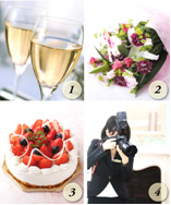 ① 乾杯用ドリンク ② 豪華なアレンジ花束 ③ パティシエスペシャルケーキ ④ 記念写真プロカメラマン