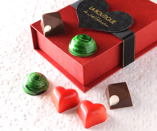 今年のバレンタインは、バリエーション豊かな5種の商品をご用意いたしました。そのなかでも発売以来ご好評いただいている「ボンボンショコラ」は、グリーン・イエロー・レッドの色鮮やかな組み合わせで、『バランス』・『口どけ』・『風味』にこだわった大人のショコラの詰合せとなり、今年は新たに12個入りを発売いたします。フレンチの巨匠ジョエル・ロブション氏が贈るバレンタインの特別なショコラを、大切な人への贈り物としてぜひご利用ください。