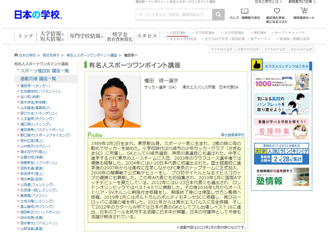 全国の大学・短大・専門学校などの学校情報を提供する、株式会社JSコーポレーション(本社:大阪市北区 代表取締役社長:米田英一)は、スポーツワンポイント講座「サッカー/権田修一選手」(https://school.js88.com/scl_h/onepoint-advice/sport?item=2&athlete=207)」を公開しました。
