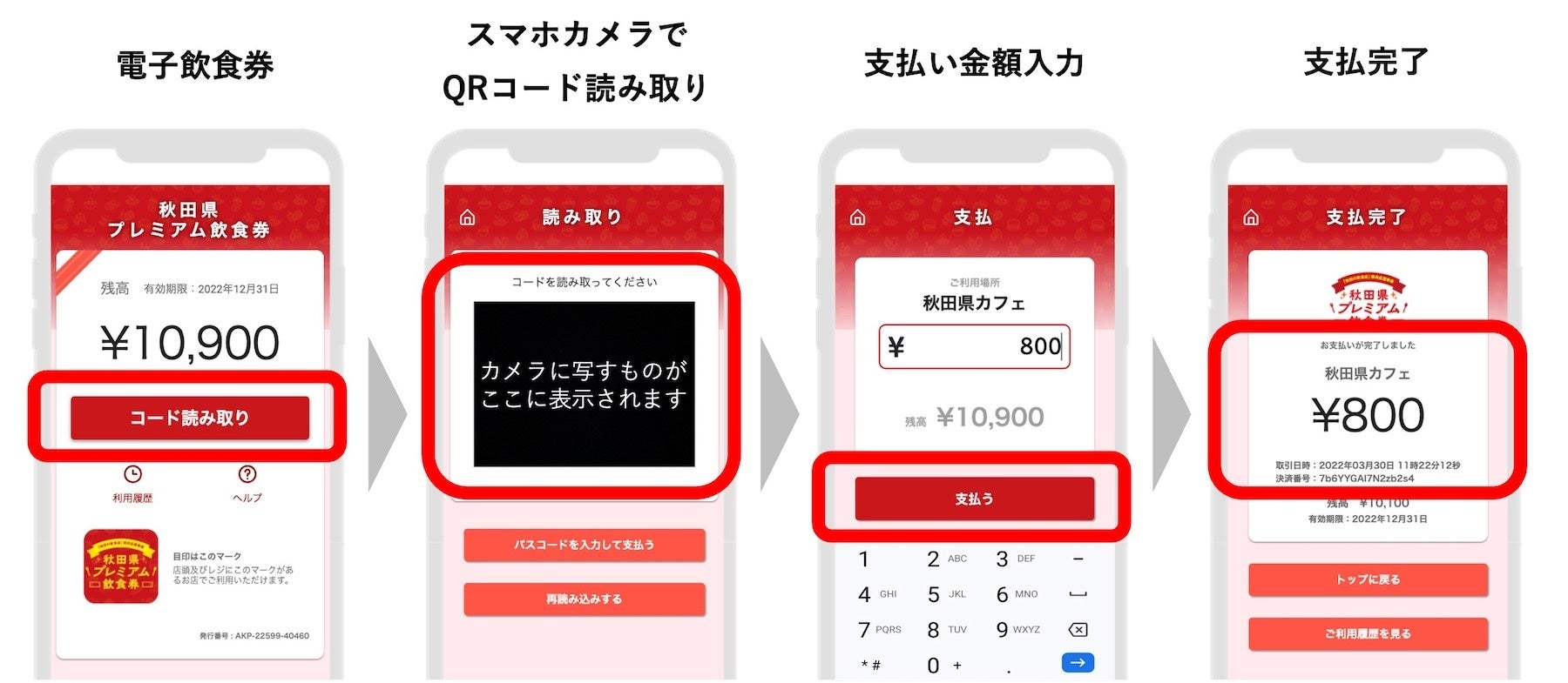 電子商品券の購入後は、秋田県の加盟店2066店舗(2022年4月20日時点)で、お会計時に1円単位での利用が可能です。また、「秋田県プレミアム飲食券」は、2022年12月15日(木)まで販売期間中、販売額に達するまで追加で複数回購入が可能です。購入した電子飲食券は、購入した一覧ページより、合算したい電子飲食券を選択すると、最新の電子飲食券に残額全てが合算され、そのまま利用することができます。加盟店での利用(認証)手段は、加盟店の負担軽減を目的に、QRコード認証(静的MPM方式)を採用しています。利用者は加盟店にスマートフォンを持参し、公式サイトより購入した電子飲食券画面に遷移し、店舗に設置されたQRコードを読み取ったうえで、使用金額を入力・確定することで利用が完了します。加盟店での運用も大変簡単で、事前に店内にPOP等でQRコードを設置、会計時は、お客様のスマートフォンに表示される支払い完了画面を確認するのみで完了します。支払いが完了した際に「消し込み」という処理が行われ、そのタイミングで支払い金額分が利用済みの飲食券として認識されるため、再利用等の不正利用を防ぐことができます。また、紙の商品券の運用時に発生する「受領・裏書き・集計・保管・請求」といった加盟店での煩雑な作業も必要もなく、利用実績等も専用のWEBページから加盟店毎に確認することが可能です。