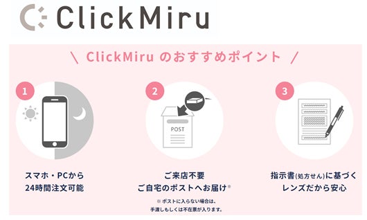24時間インターネットで注文できるサービス「ClickMiru(クリックミル)」※を使えば、来店せず簡単に注文することができ、ご自宅のポストにお届けいたします。