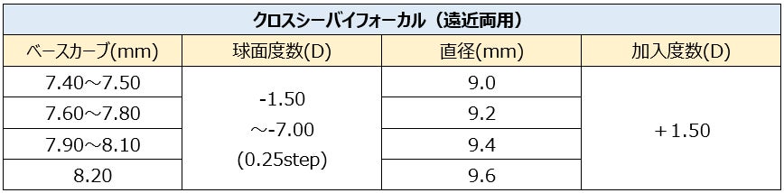 今回は、近視用の「クロスシー」に加えて、遠近両用タイプの「クロスシーバイフォーカル」も同時に発売いたします。メニコンの遠近両用コンタクトレンズシリーズ「Lactive」に使い捨てハードコンタクトレンズの「クロスシーバイフォーカル」が加わることで、より多くの方にご利用いただける商品ラインアップとなりました。