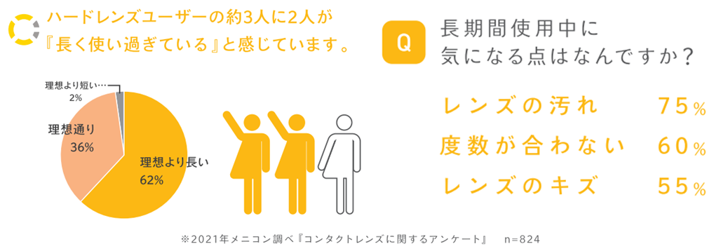 当社調べによると、ハードコンタクトレンズユーザーの多くが「レンズ状態や見え方に我慢しながら理想の期間より長くレンズを使用している」という状況が分かりました。その状態を改善すべく、3ヵ月使い捨ての「クロスシー」が誕生しました。不調が出ても直ぐに交換できるため、ハードレンズをもっと便利に、もっと快適にご使用いただけます。