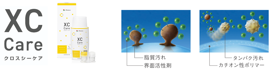 「クロスシー」、「クロスシーバイフォーカル」用の洗浄保存液「クロスシーケア」も同時に発売。2つの成分(界面活性剤とカチオン性ポリマー)でつけおき中に汚れの付着を防止します。