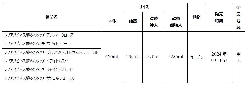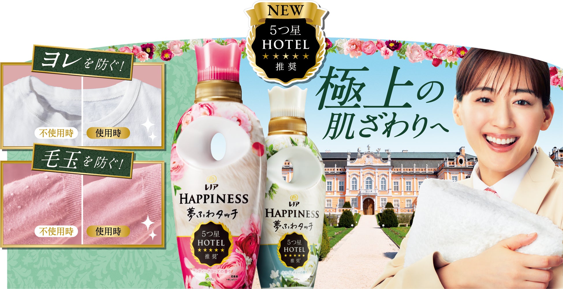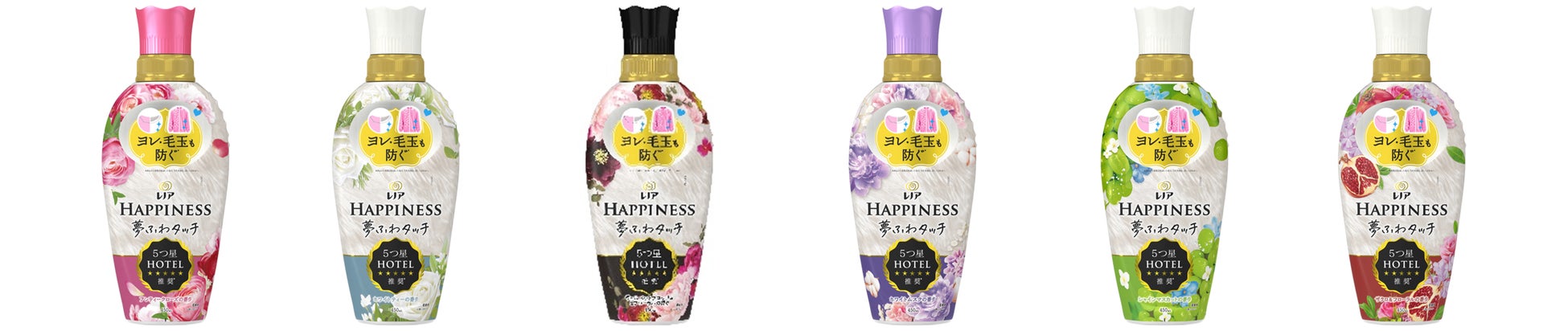 今回の製品リニューアルでは、“毎日洗濯する服もなるべく傷めたくない”という消費者ニーズにあわせて、Tシャツの首元のヨレやニットの毛玉などの衣類のダメージを防ぎながら*1、シルクのようになめらかな肌ざわりに洗い上げます。さらに5つ星ホテルが認めたふんわり贅沢な香りをお楽しみいただけます。また、シリーズの中でも特に人気の香りである「アンティークローズ」と「ホワイトティー」、「ヴェルベットブロッサム&フローラル」の3種類のラインアップにて、香料成分をアップグレードしました。加えて、全ラインアップのパッケージデザインを刷新、背景は柔らかなファーのようなデザインを採用し、パッケージからも、ふわふわの洗い上がりと肌ざわりをイメージしていただけます。毎日の服の洗濯ダメージを防ぎながら、シルクのようになめらかな肌ざわりに洗い上げる「レノアハピネス夢ふわタッチ」シリーズで、5つ星推奨*2の上品な香りと、ふんわり贅沢な肌ざわりをお楽しみください。