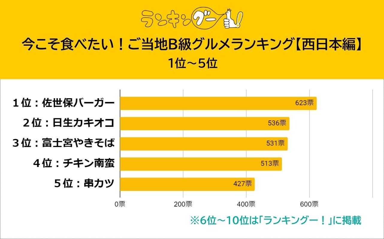 1位「佐世保バーガー」は623票、2位「日生カキオコ」は536票と87票の差、さらに3位「富士宮やきそば」と2位は5票で僅差になるなど、以降の順位でも100票以上の差は開かず。西日本のご当地B級グルメでは、比較的均等に各地方それぞれのメニューへと投票者の関心が向いていることが感じられました。東日本のご当地B級グルメ調査レポートも近日発表予定です。
