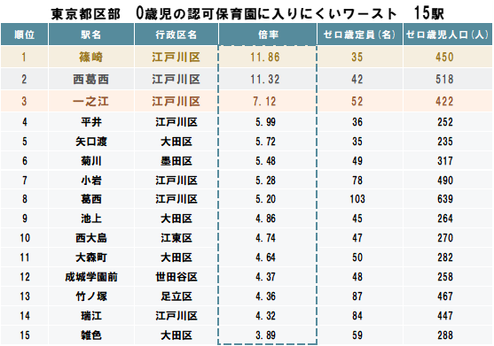 上位3駅の顔ブレは変化が無いが、ワースト1位の篠崎駅では11.9倍(前年11.2倍)とゼロ歳人口の増加の定員の減少で悪化、一位となった。尚今年も上位4駅は江戸川区となり、同区では区の方針もあり認可保育園への入園は極めて難しい状況が続く。