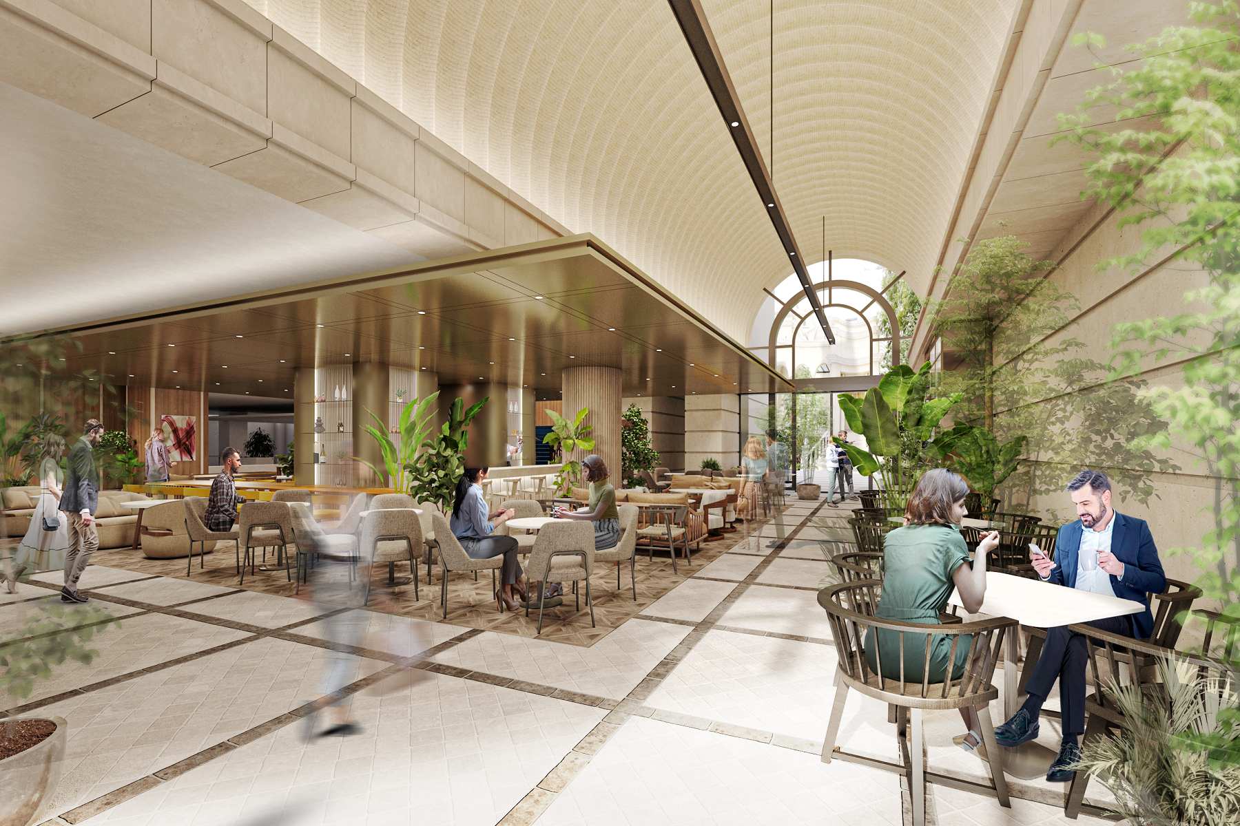 エントランスを進んだ先は、開放的な空間で和やかな賑わいを感じられる場所に。街ゆく方が通ってみたくなる開放的な空間。