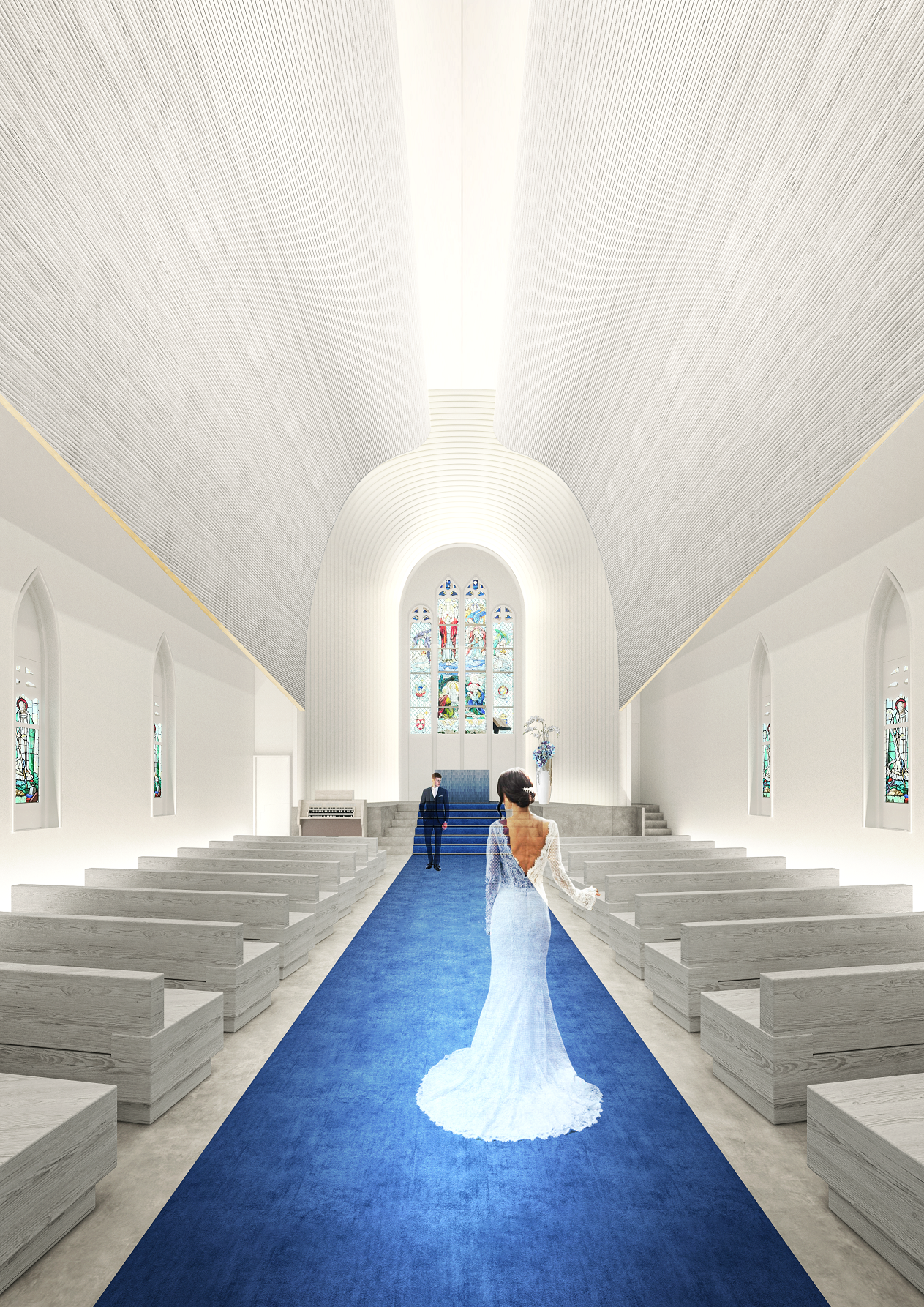 オープン当初から24年間大切にし続けてきたロイヤルブルーのバージンロードとウィリアムモリスのステンドグラスを象徴とし、「光」と「花」でおふたりの明るい未来を祝福するチャペルにリニューアル。