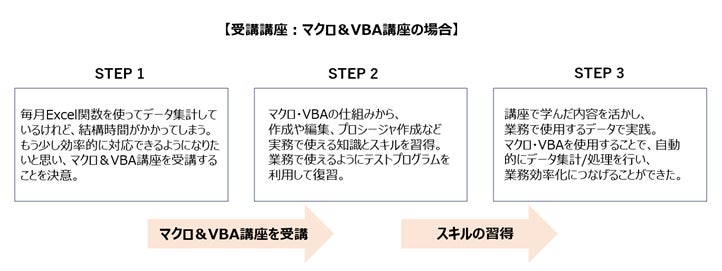 学習がどのようにご自身のキャリアアップへ繋がっていくのかをイメージしていただけるように、講座受講~スキル習得までの流れを事例でご紹介します。