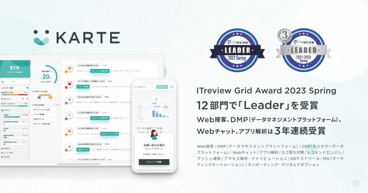 KARTE が「ITreview Grid Award 2023 Spring」12部門にて4期連続で「Leader」受賞