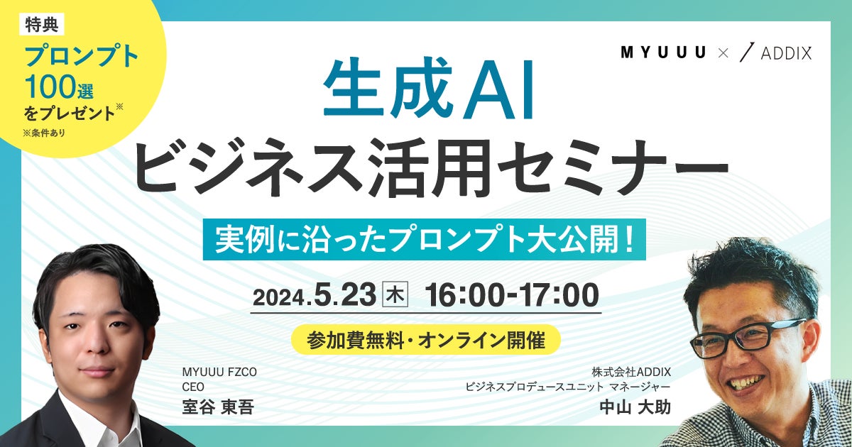 株式会社ADDIX(所在地:東京都港区、代表取締役社長:伊藤雄剛 以下、ADDIX)は、「生成AIビジネス活用セミナー〜実例に沿ったプロンプト大公開!プロンプト100選のプレゼント方法をご案内!~」と題したセミナーを、5月23日(木)にオンラインにて開催します。