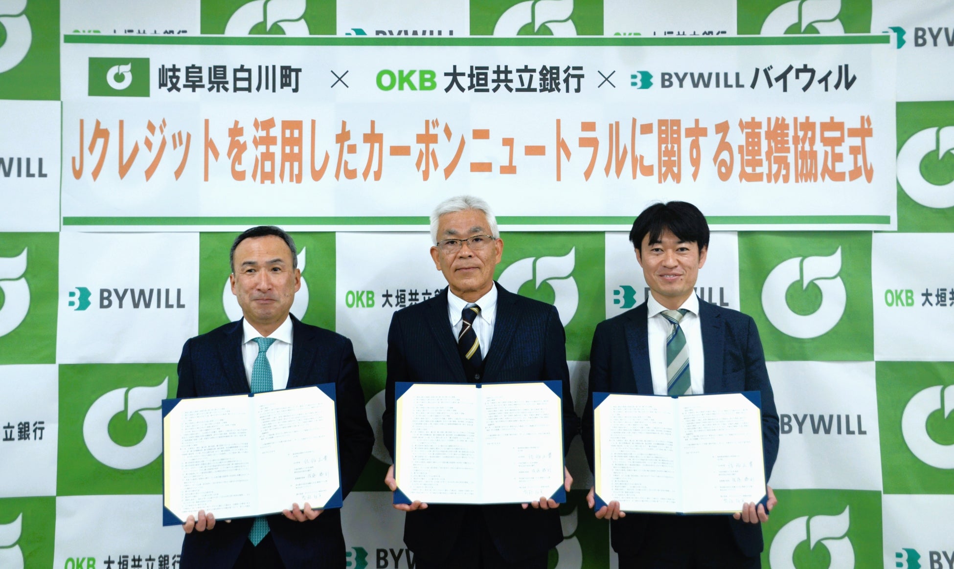 日本全国47都道府県のカーボンニュートラル実現を目指す株式会社バイウィル(本社:東京都中央区、代表取締役社長:下村 雄一郎、以下「バイウィル」)は、岐阜県加茂郡白川町(町長:佐伯 正貴、以下「白川町」)、株式会社大垣共立銀行(本店:岐阜県大垣市、取締役頭取:林 敬治、以下「大垣共立銀行」)と、「J-クレジットを活用したカーボンニュートラルに関する連携協定」を締結しました。