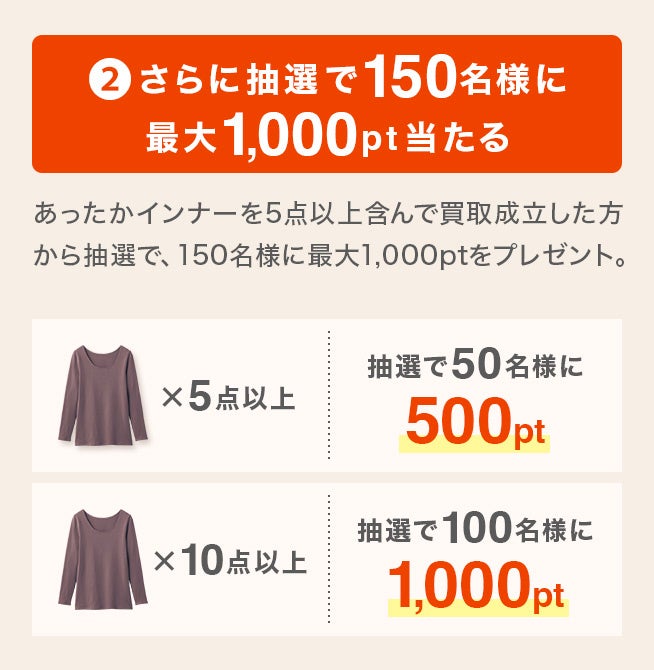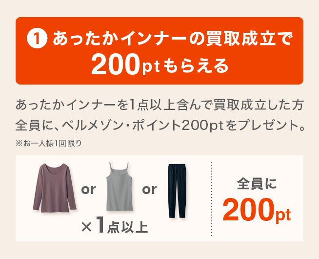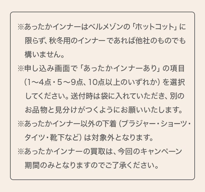 キャンペーン期間中にキマワリ ファッションにお申し込みいただき、秋冬用インナーを1点以上含んで買取成立した方全員にベルメゾン・ポイント200ポイントをプレゼント。さらに、5点以上含んで買取成立した方には抽選で50名様に500ポイントを、10点以上含んで買取成立した方には抽選で100名様に1,000ポイントが当たります。