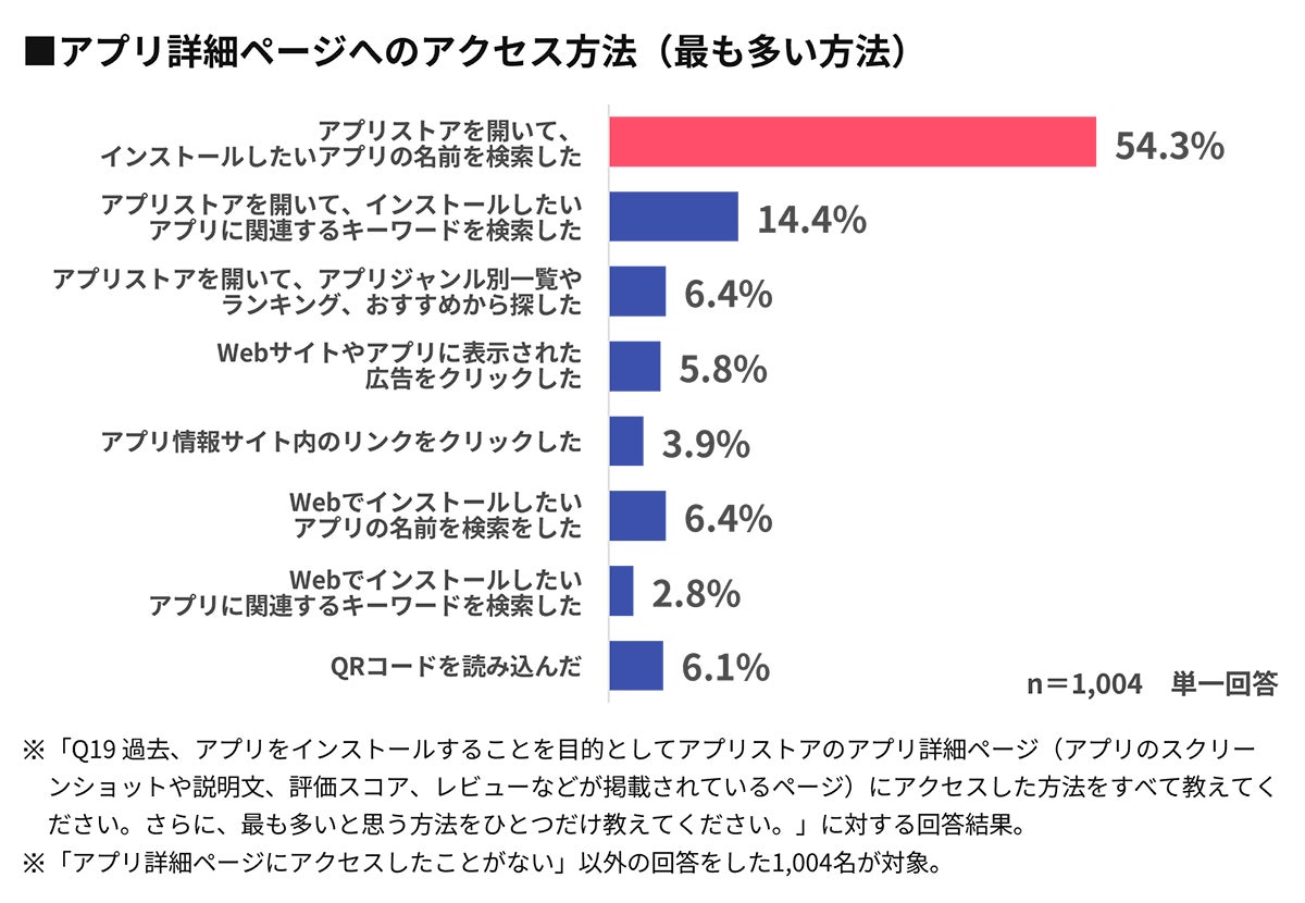 54.3%が「アプリ名での指名検索(アプリストア内検索)」によるアプリ詳細ページへのアクセスが、最も多いとしている