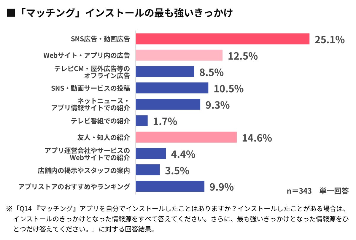 本調査では、アプリを12カテゴリに分け、各カテゴリのアプリのインストール経験がある人に、そのきっかけとなった情報源について尋ねています。「店舗系会員」アプリを除くすべてのアプリカテゴリで、「SNS広告・動画広告」が「インストールの最も強いきっかけとなった情報源」の上位3位以内に入りました。
