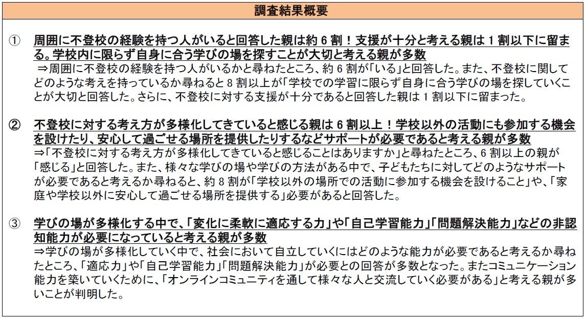 調査の結果、小学生の子どもを持つ親の約6割が周囲に不登校の経験を持つ人がいると回答しました。また、不登校に対しての支援制度が整っていると考える親は1割以下に留まり、学校内に限らず自身に合う学びの場を探すことが大切と考える親が多いことがわかりました。また、不登校に対する考え方が多様化してきていると感じる親は6割以上にのぼることが判明しました。学校以外の活動にも参加する機会を設けたり、安心して過ごせる場所を提供したりなど、サポートが必要であると考える親が多数となっています。さらに近年、学びの場が多様化する中で、「変化に柔軟に適応する力」や「自己学習能力」などの非認知能力が必要になっていると考える親が多いことがわかりました。