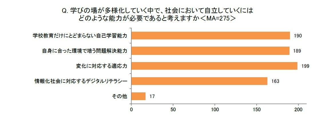 「学びの場が多様化していく中で、社会において自立していくにはどのような能力が必要であると考えますか<MA>」と子どもを持つ親に尋ねたところ、「変化に対応する適応力」(199)との回答が最も多く、次に「学校教育だけにとどまらない自己学習能力」(190)、「自身に合った環境で培う問題解決能力」(189)との回答が続き、いずれも7割前後となりました。