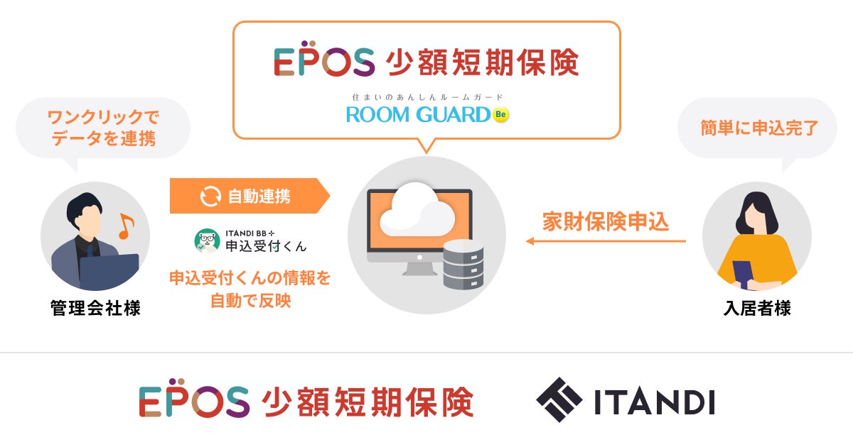 2024年3月、イタンジとエポス少額短期保険はシステム連携し、イタンジが提供する仲介会社利⽤率No.1 (※1)の不動産関連WEB申込受付システム「申込受付くん」 の入居者情報を、エポス少額短期保険が提供する賃貸入居者向け家財保険「ROOM GUARD Be」の申込システムと連携できるようになりました。管理会社は「申込受付くん」の管理画面から、保険加入に必要な入居者情報を保険申込システムにワンクリックで連携できるようになります。入居者も、保険申込システムに⼊居者情報や物件情報が既に反映されているため、最⼩限の情報⼊⼒のみでなめらかに家財保険の⼿続きが完結させることができます。なお、「申込受付くん」は保険会社との連携が、今回で11社目となります。