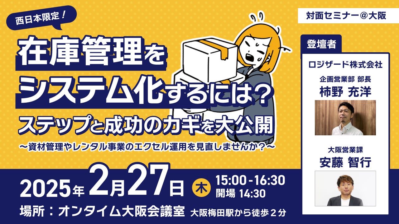 クラウド型在庫管理システムのリーディングカンパニーであるロジザード株式会社(東京都中央区、代表取締役社長:金澤 茂則、以下:ロジザード)は、2月27日(木)に対面セミナー『西日本限定!在庫管理をシステム化するには?ステップと成功のカギを大公開』の開催を決定、申し込み受付を開始しましたのでお知らせいたします。