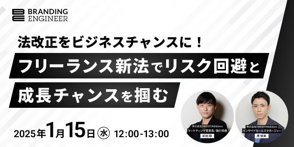 株式会社TWOSTONE&Sonsの100%子会社である株式会社Branding Engineer(所在地:東京都渋谷区、代表取締役CEO:河端保志、代表取締役COO:高原克弥、以下Branding Engineer)は、2025年1月15日(水)に、フリーランスエンジニア活用を検討する企業の責任者・人事担当者を対象に、オンラインセミナーを開催することをお知らせいたします。本セミナーでは、フリーランス新法の概要や具体的な対応策を解説することで、企業の成長に繋げるフリーランスエンジニア活用についてのヒントを提供いたします。