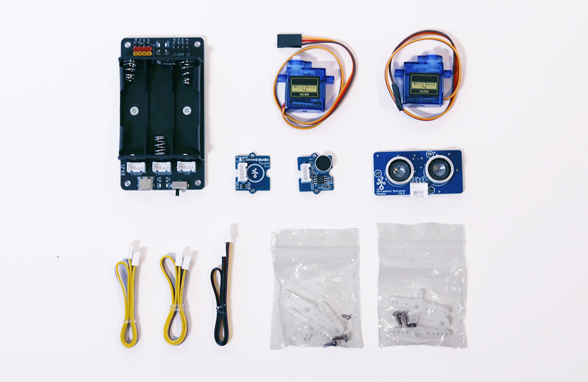 内容物:メイカーボード(1個)、タッチセンサ―(1個)、音センサ―(1個)、超音波センサー(1個)、サーボモーター(2個)