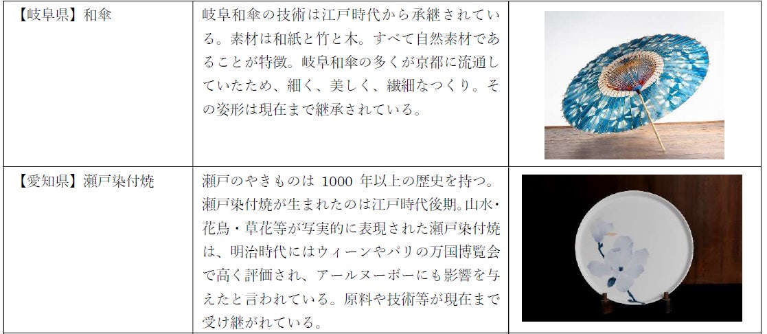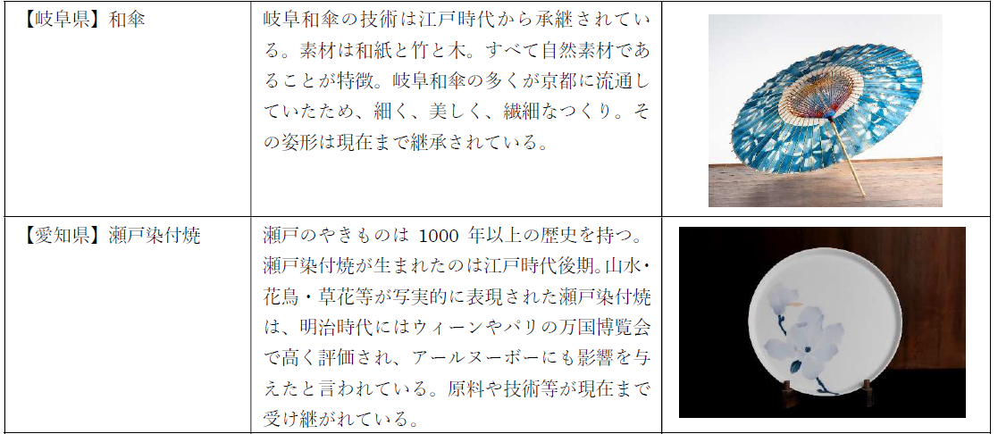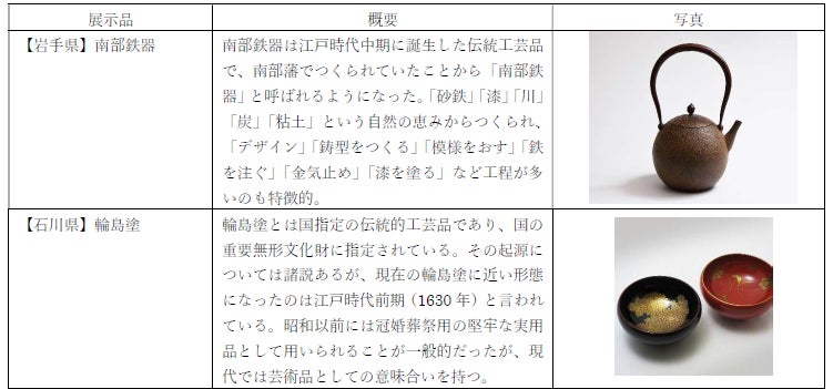 展示品:【岩手県】南部鉄器、【石川県】輪島塗、【岐阜県】和傘、【愛知県】瀬戸染付焼、
