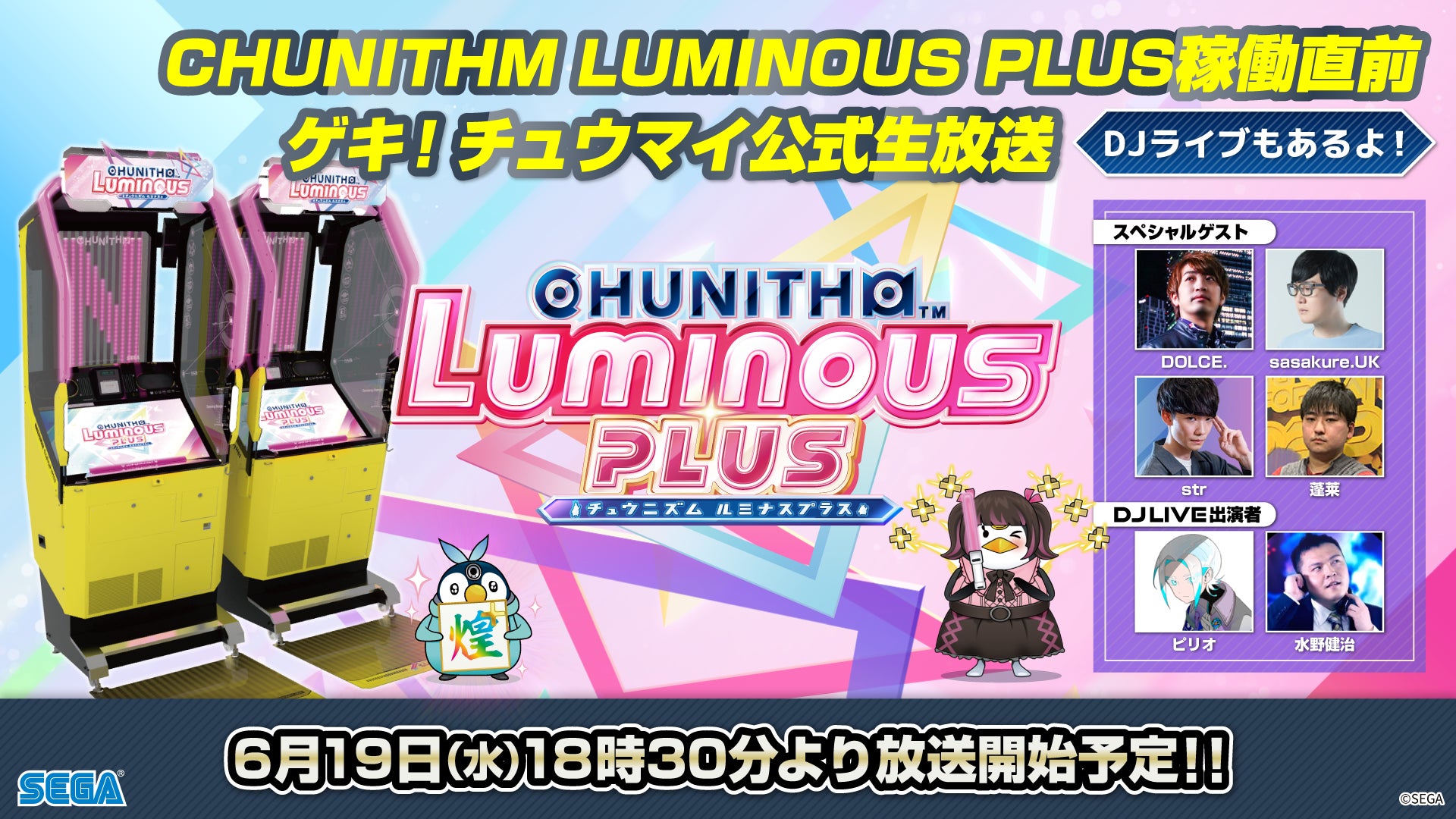 この新バージョン稼働を記念して、稼働前日の2024年6月19日(水)18時30分より、公式生放送番組『CHUNITHM LUMINOUS PLUS稼働直前! ゲキ!チュウマイ公式生放送~DJライブもあるよ!~』を配信いたします。