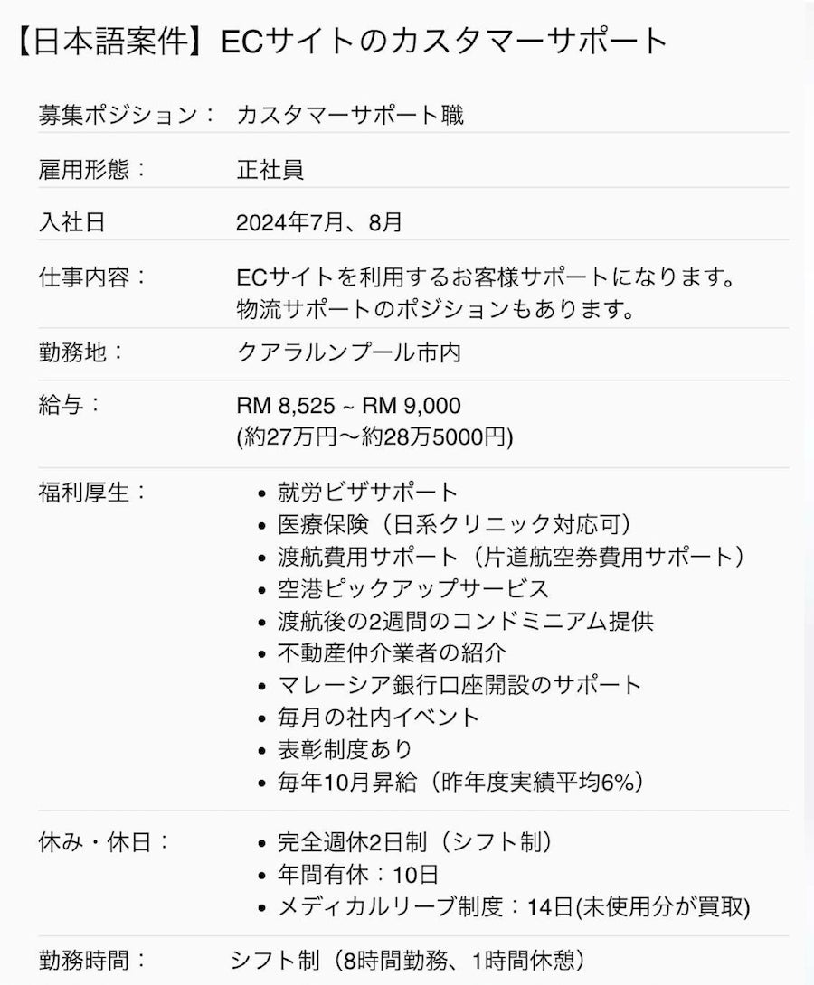 マレーシアの「CS MALAYSIA」と提携し、就職先の紹介や相談に対応。就職体験談も公式サイトで公開中。