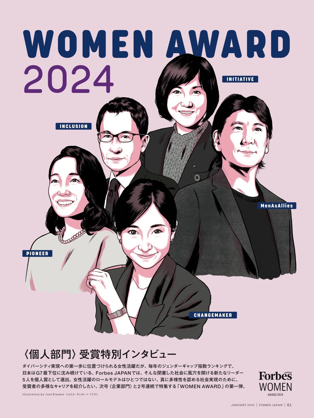 日本のダイバーシティ実現の第一歩として「女性の活躍」を掲げ、「WOMEN AWARD」を開催してきたForbes JAPAN。今年の受賞企業および個人受賞者を、2号連続で紹介する。今号には、生え抜きで地方銀行の代表取締役に就任した女性、「ココイチ」FC社長に抜擢された22歳、日本の企業初となる同性パートナーシップ制度を実現させた日本IBM社員ら、5人の個人部門受賞者が登場。選考を務めたサニーサイドアップグループ次原悦子社長、サンリオエンターテイメント小巻亜矢社長らの講評も必読。