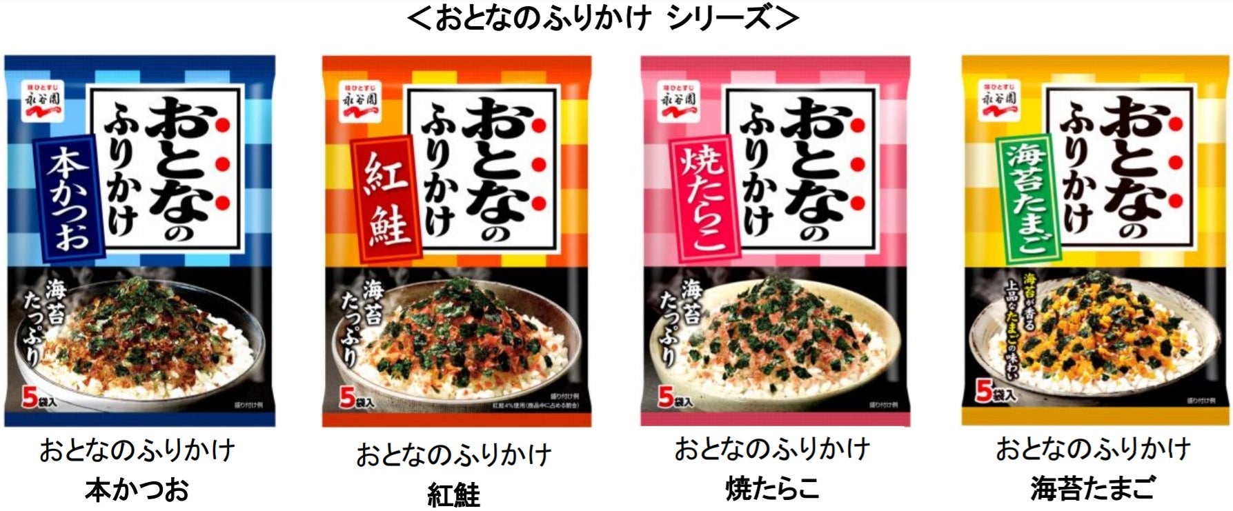 ふりかけは“子どものごはんの友”として親しまれてきましたが、1989年10月に“子どもだけでなく大人も楽しめる、素材の味を活かしたふりかけ”をコンセプトに、メニューと味にこだわって開発したのが「おとなのふりかけ」です。わさびの他に4品(本かつお、紅鮭、焼たらこ、海苔たまご)を展開しています。