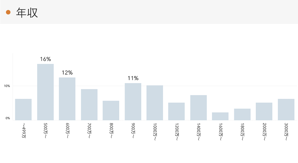 - 成約顧客の年収帯のボリュームゾーンは500万円台が16%、600万円台が12%、900万円台が11%。