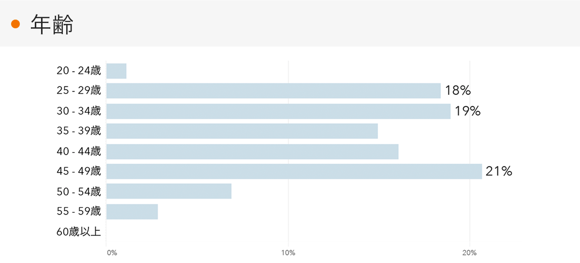最も割合の多い年齢帯は45〜49歳で21%(前月比8ptアップ)、次に多い割合は30〜34歳の19%、続いて25〜29歳の18%となります。45〜49歳の割合は、マンスリーレポート開始以来最も高い割合となっています。