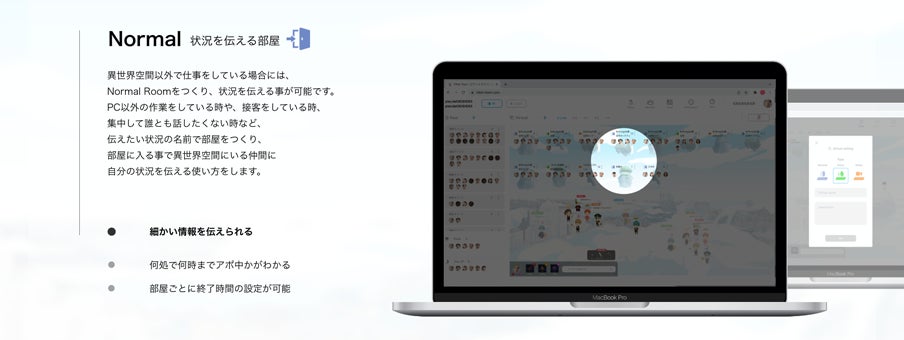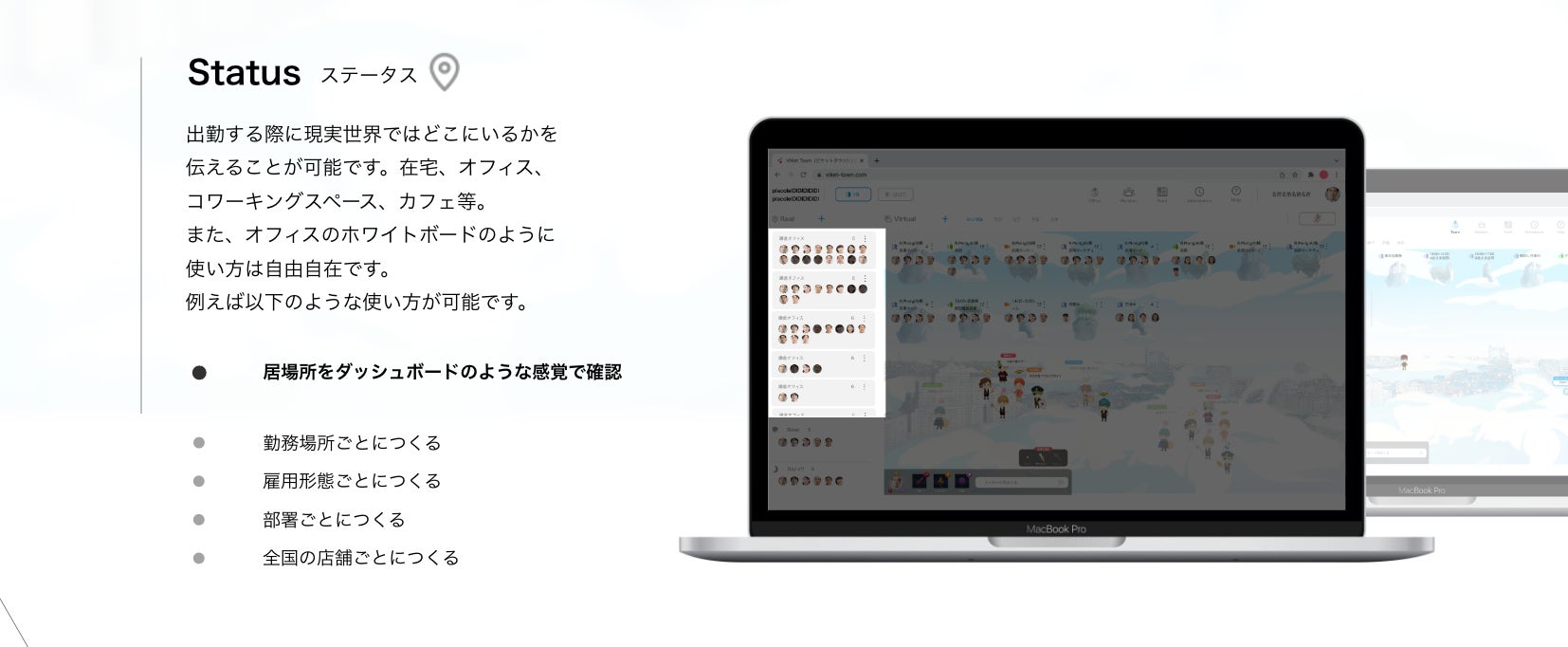 | 1 | 場所からの自由 | アバターチャット機能、ビデオ通話、音声通話、位置情報、スポット登録 |