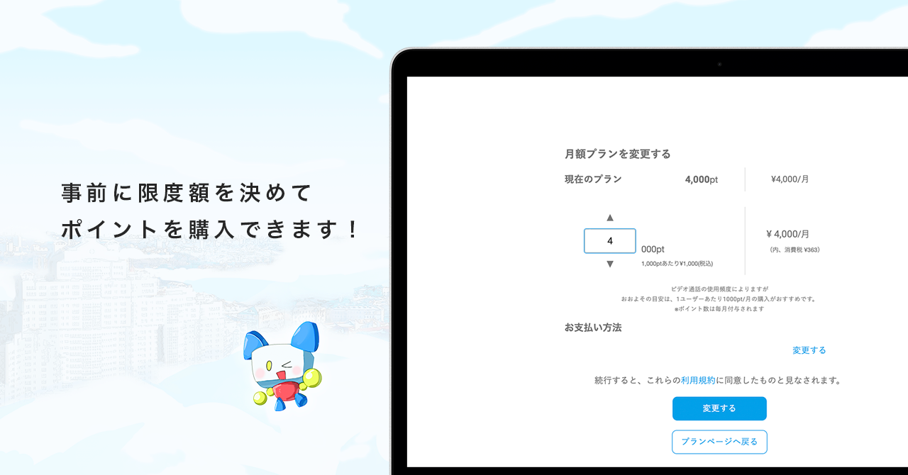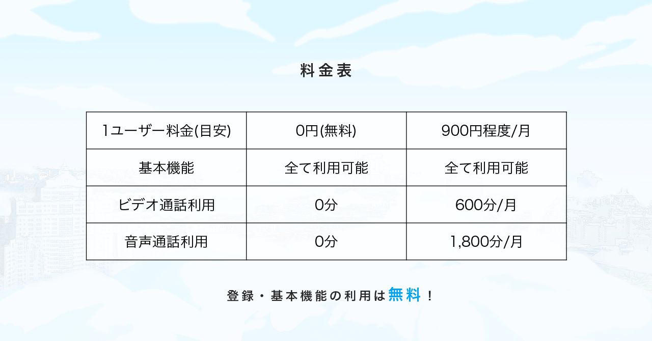 ViKet Townは、基本機能は全て無料(0円)でご利用いただくことが可能で、ビデオ通話・音声通話のみ有料になります。ビデオ通話・音声通話に関して、事前に限度額を決めてポイントという形で購入いただきます。通話の使用料に応じて、ポイントから差し引かれる仕組みです。有料機能は1000円〜ご利用いただけます。(通話機能をご利用いただく場合、1ユーザーの目安は900円程度です)