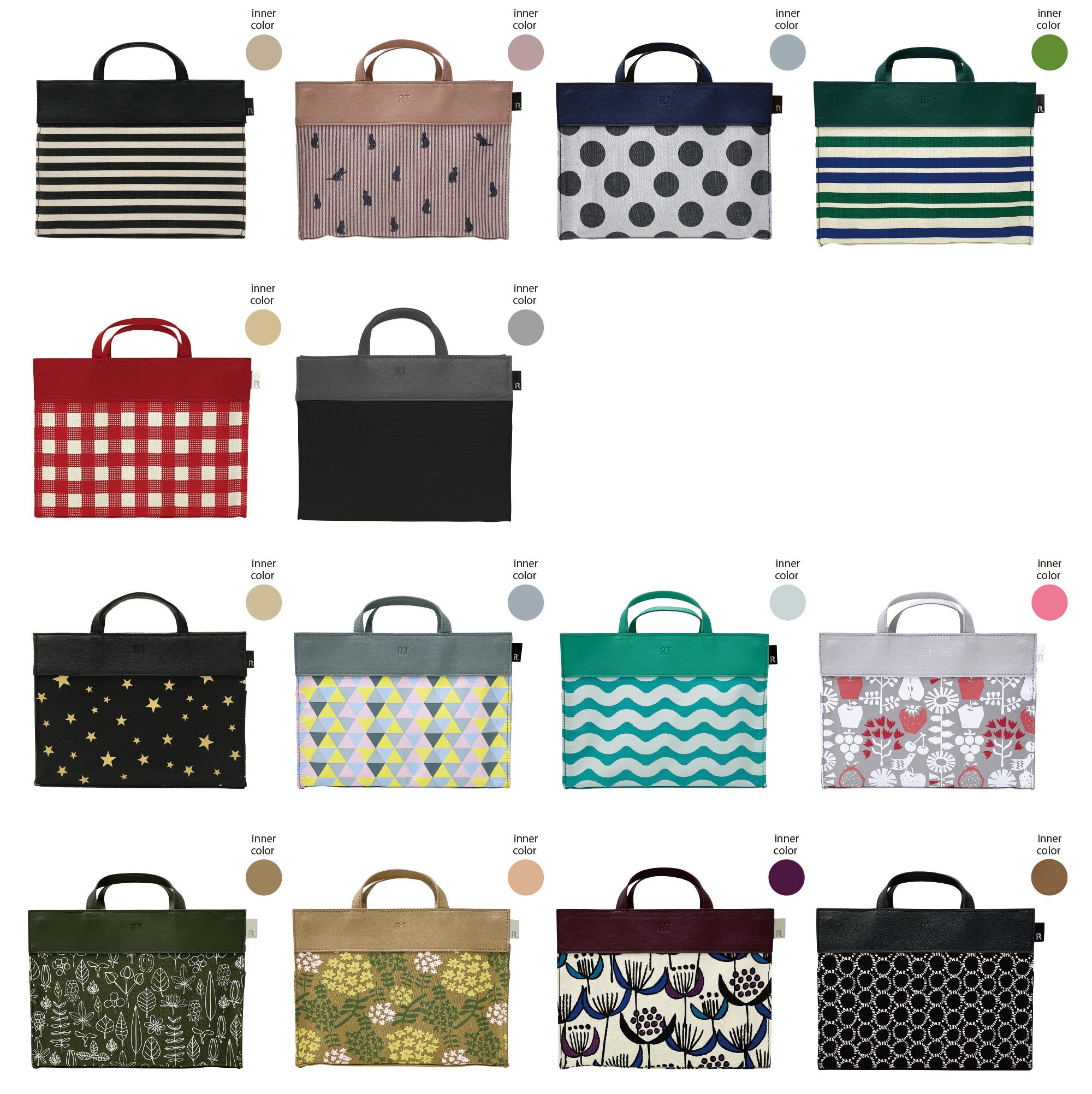 LT.RC.Remo-te-C 2,970円(6793 01 BLACK-Stripe、02 CAT、03 NAVY-DOT、04 GREEN-Stripe、05 RED-check、06 BLACK)サイズ:W25×H19×D11cm 持ち手:15cm 素材:表地/綿 裏地/ポリエステル 持ち手/合成皮革 ドットボタン ポケット:外側2箇所、内側6箇所 ※1月下旬発売予定