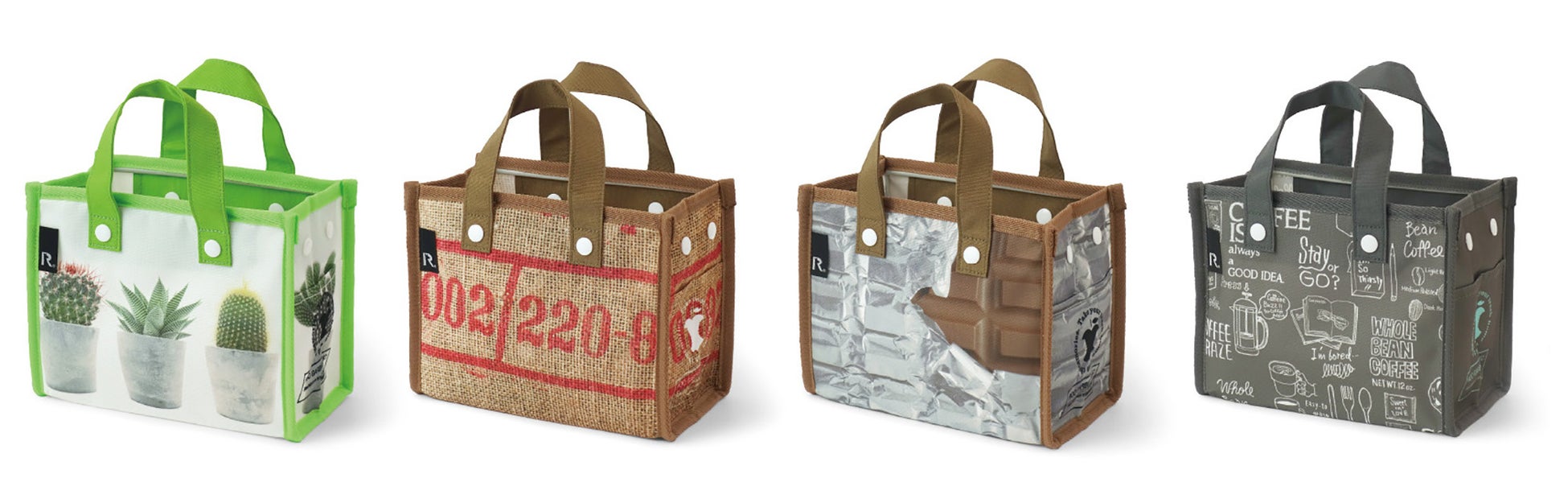 RGB.RPET Poly Desktop-A 2,200円(9677 01 Cactus、02 ’002、03 Chocolate、04 Coffee)サイズ:W21×H16×D11cm 持ち手長さ:21cm 素材:ポリエステル(リサイクル)、ドットボタン 芯材:PE ポケット:外側1箇所 特許取得済 ※発売中